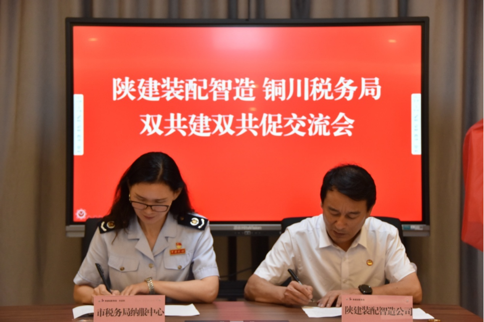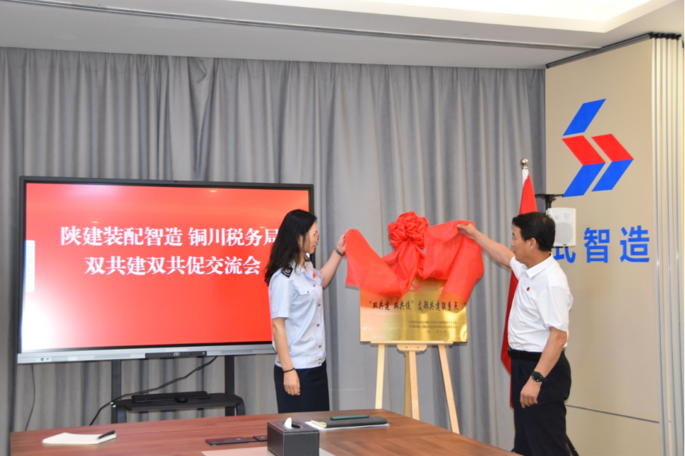 铜川税务局纳税服务中心党支部书记郭秀梅、陕建装配智造公司党支部书记王辉共同为“双共建 双共促支部共建联系点”揭牌