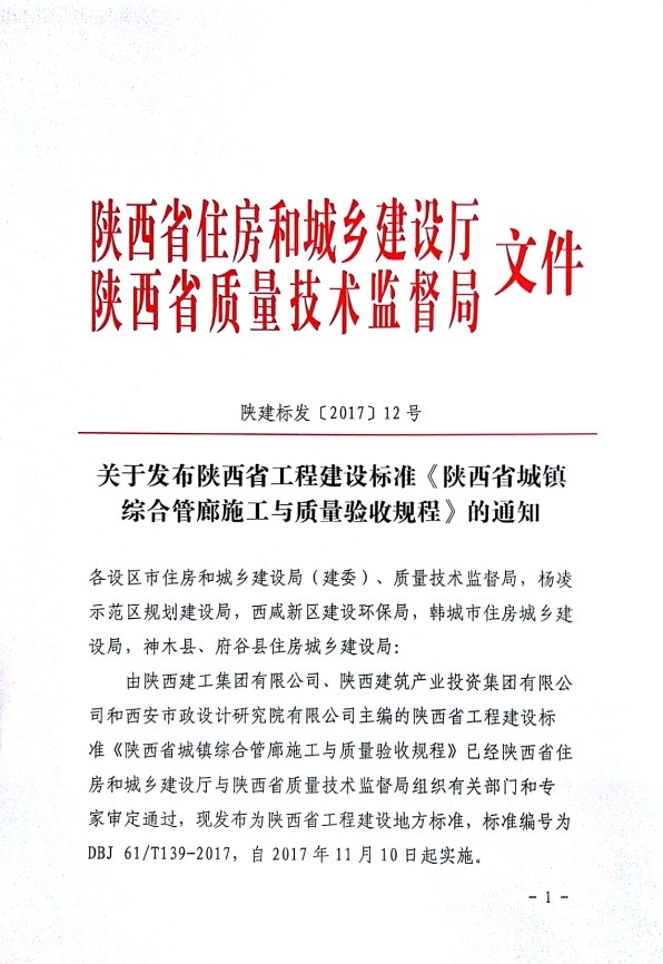 近日,由陕建投资集团主编的《陕西省城镇综合管廊施工与质量验收规程》经陕西省住房和城乡建设厅与陕西省质量技术监督局批准发布,标准编号为DBJ 61/T139-2017,自2017年11月10日起实施。这是陕建投资集团在编写工程建设地方标准方面取得的一项重要科研成果,充分显示了集团在城镇综合管廊领域的综合技术实力。