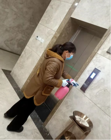 新型建材工作人员正在对办公楼侧门、电梯按键进行消毒