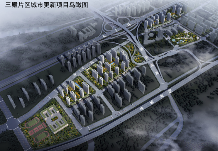 、三殿村片区城市更新项目是西安市城市更新项目首个成片试点区,项目建成后将解决三殿村4640户居民回迁安置问题,也是灞桥区打造完善城市功能、提升城市品质、改善人居环境的市级重点建设项目。三殿村片区城市更新项目安置楼建设分4个板块,占地256亩,规划建设安置楼36栋。项目建成后将妥善安置三殿片区及高铁东城片区的5600余名群众,预计2024年年底全面建成。